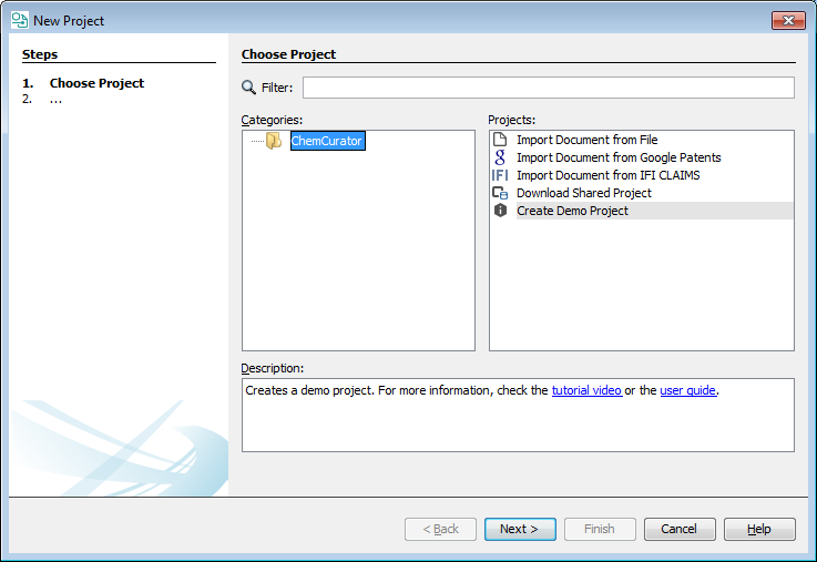 Compounds extraction wizard is available in Compounds and Markush view. This wizard can help to automatically find and extract a large number of chemical structures from the documents. In the first panel of the wizard, some basic filter criteria are available.