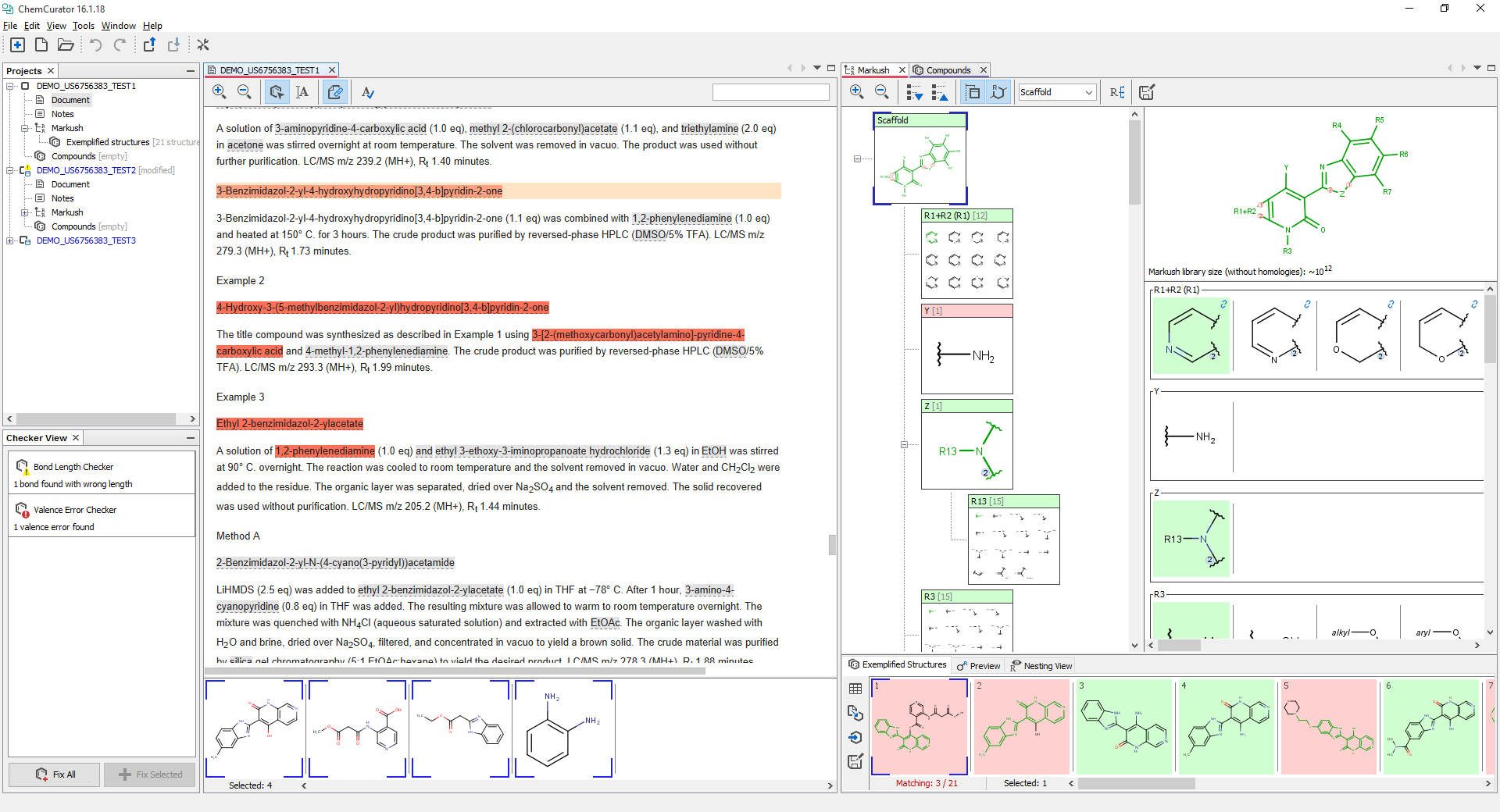 ChemCurator supports two types of chemical information: Markush structures, and Compound lists. Markush structures are always created together with a linked special compound list that stores the corresponding exemplified structures.