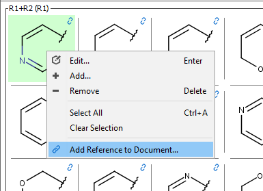 Markush fragments and compounds can be added manually from fragment and compound list's context menu and with the Add new row menu item of the compounds view.