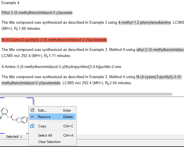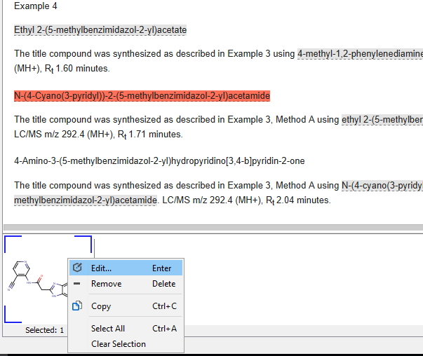 Manually added compounds can be linked to the corresponding part of the document. After a right click on any structure, you can select Add reference to document... function to specify the corresponding part of the document. After starting this action, document view enters reverse linking mode and any part of the document can be selected. After selecting the corresponding part of the document and clicking on OK, the selected part of the text will be marked as a chemical entity and linked to the manually added compound. If Add to local dictionary check box is also checked, the selected text and the linked compound are added to ChemCurator dictionary and will be recognized next time during annotations.