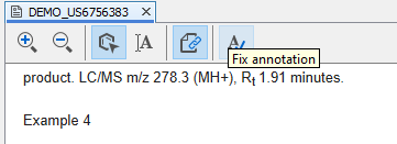 Document view is the viewer component of the annotated documents and the related selections. The recognized chemical entities are highlighted by gray. In structure selection mode images/download/thumbnails/1806331/image2014-12-3_12_28_8.png users can select recognized chemical structures by clicking on any highlighted component or select a larger part of the document by pressing left mouse button and dragging it over the targeted part of the document. The selected structures are highlighted by red and displayed under the document in the selection panel. In text selection mode images/download/thumbnails/1806331/image2014-12-3_12_30_1.png users can select the document text directly. Document linking images/download/thumbnails/1806331/image2015-2-25_15_57_42.png turns on the automatic scrolling of the document based on the structure selections in the editor views. With images/download/thumbnails/1806331/image2014-12-3_12_34_47.png and images/download/thumbnails/1806331/image2014-12-3_12_35_20.png document's zoom level can be changed.