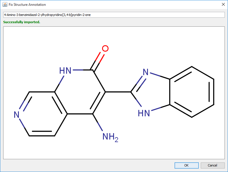 After clicking on the OK button, an interactive fixing dialog opens. If the modified text can be recognized, the recognized structure appears under the text input field. The structure immediately follows any modification of the text. Potentially problematic parts of the chemical names are underlined. After successful fixing, the recognized chemical structure can be added to the corresponding part of the document by clicking on OK button.