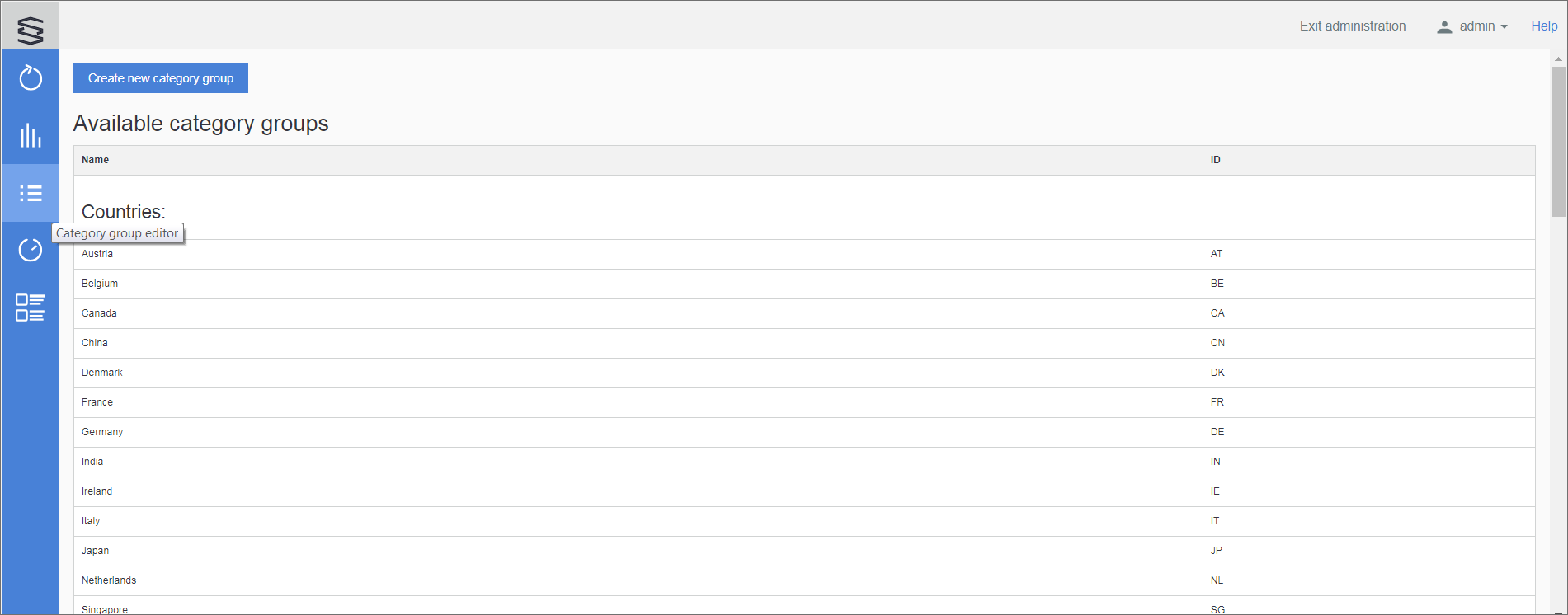 User-defined category groups can be created by clicking on the ** Create new category group ** button on the top of the page.