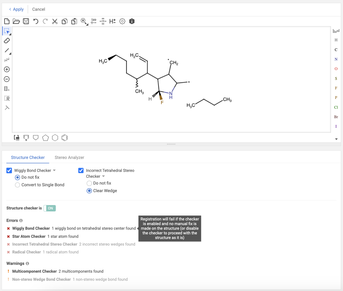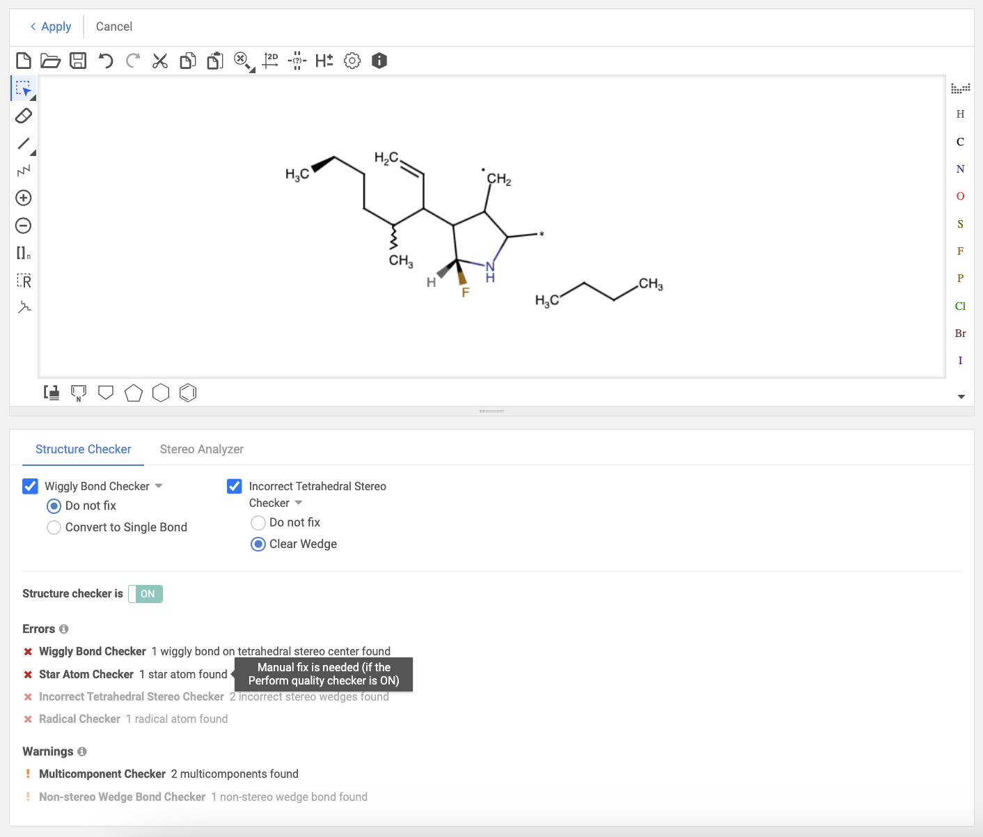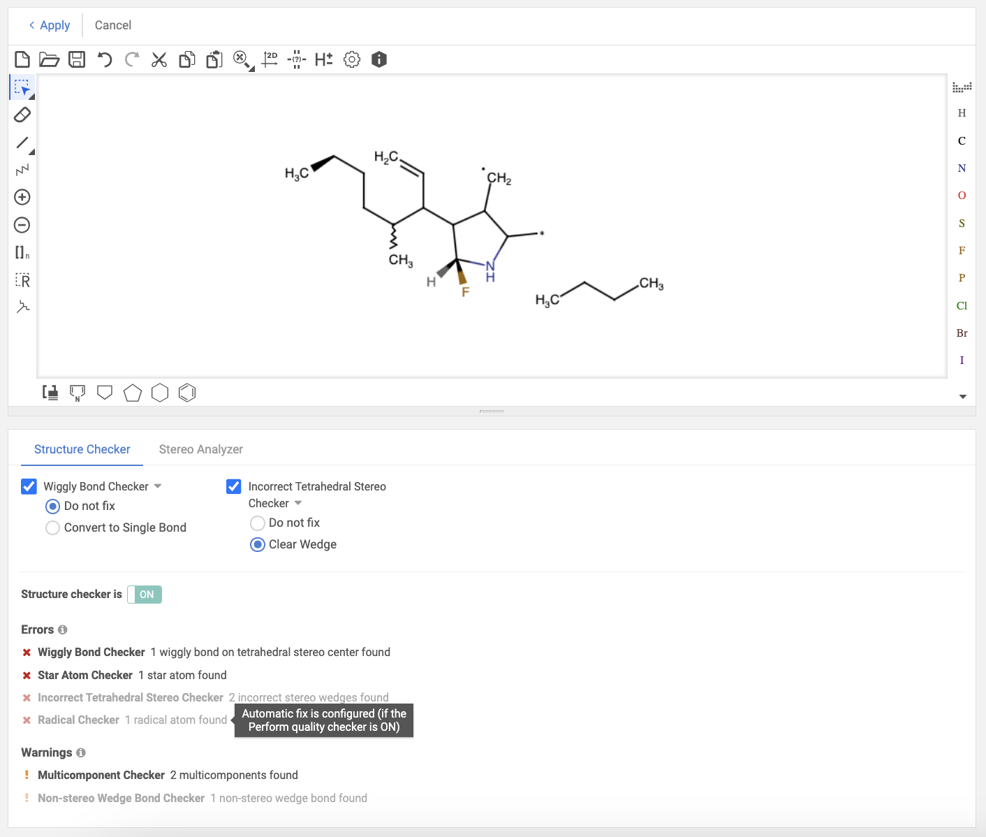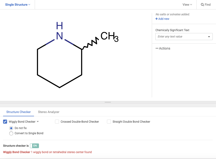 Using the Stereo Analyzer option, stereocenters and stereo double bonds can be recognized. User can even automatically change structures by applying fixers to the molecule.