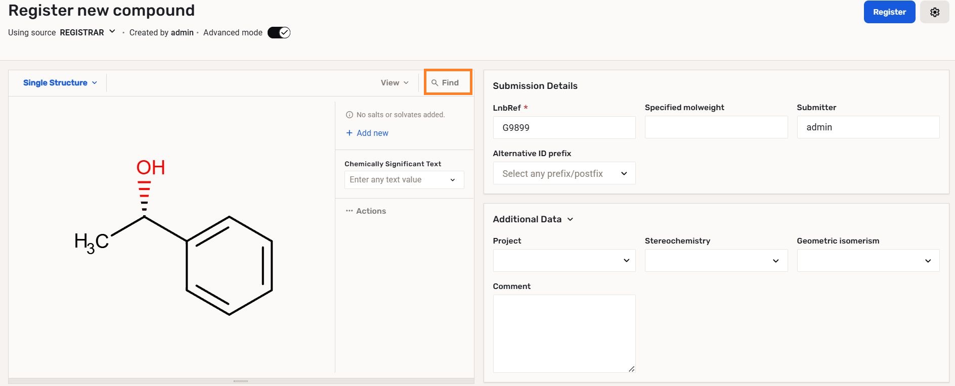 A Suggestion list that contains the already registered matching compounds can be accessed from the Find option located on the top right corner of the structure editor.