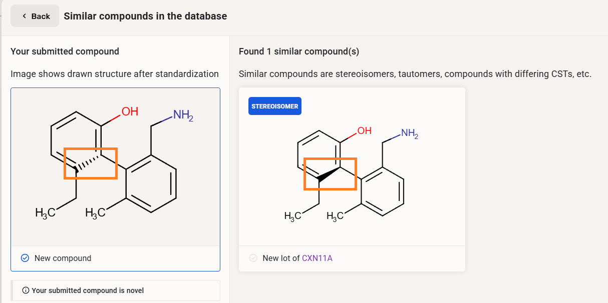 If configured (Administration/Chemistry/General), the Stereoisomer match type will cover also atropisomers. Using Autoregistration these compounds will be registered as different compounds.