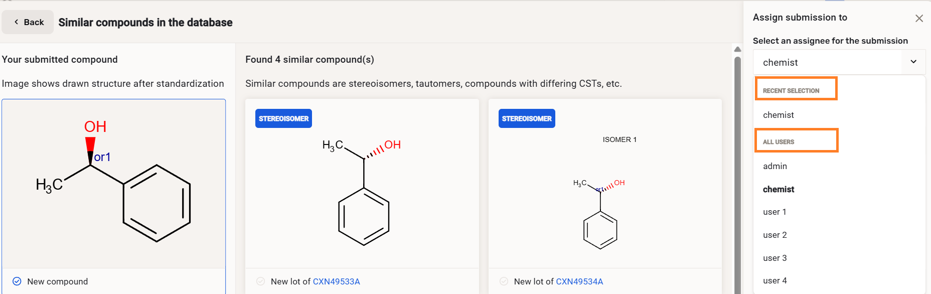 Submissions can be assigned to other users even before the registration process is started. After drawing the compound, the current user can click the Find button in order to check the existing matches in the database or to assign the compound to other users. (In advanced mode or on the submission page this suggestion list is also available after clicking to the Register button and the assignment can be done here with the help of 'Assign to' button.) All users (from the DB and from external sources) are displayed here. The logged-in user can select the assignee of the submission from a list of users. The list contains all users (from the DB and from external sources). In the top of this list the recent selection , the last 5 choices are shown and below this, the list of all users is shown. The username, e-mail address and full name properties of a user are displayed in the user selector dropdown and are all searchable through a typeahead filter.
