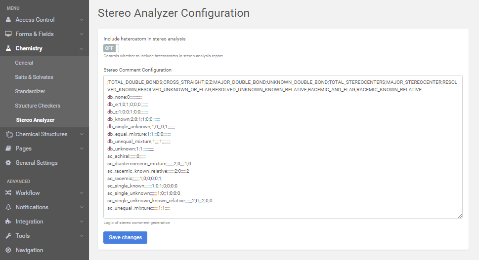 This menu includes a set of chemistry field related settings: