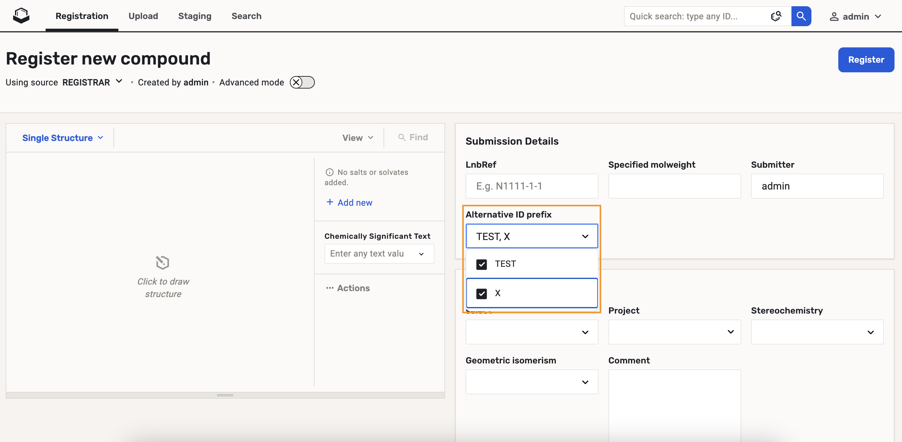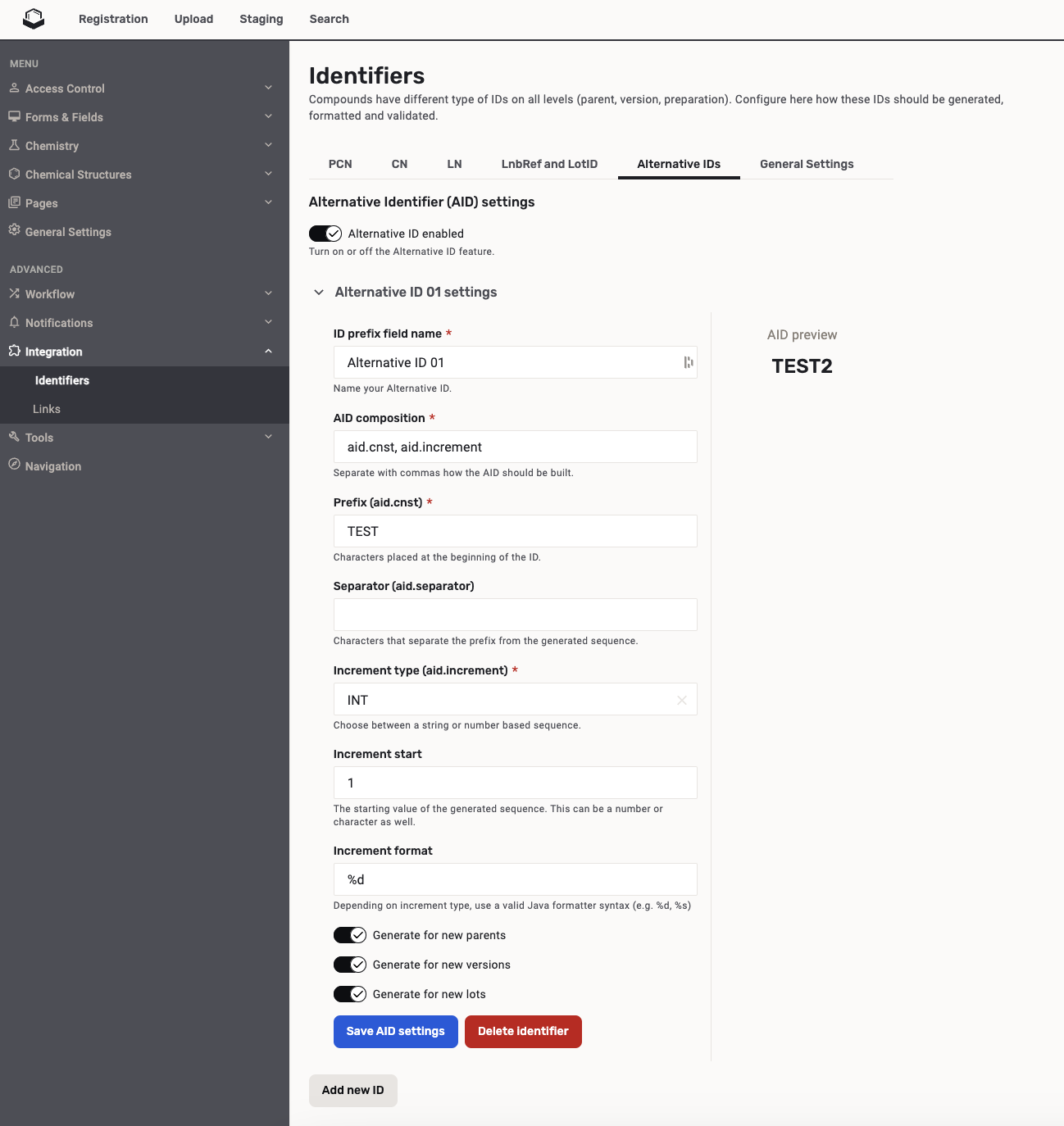 Since version 24.3.4 Secondary (alternative) identifiers can be configured on the Administration page to be assigned to the registered compounds.
