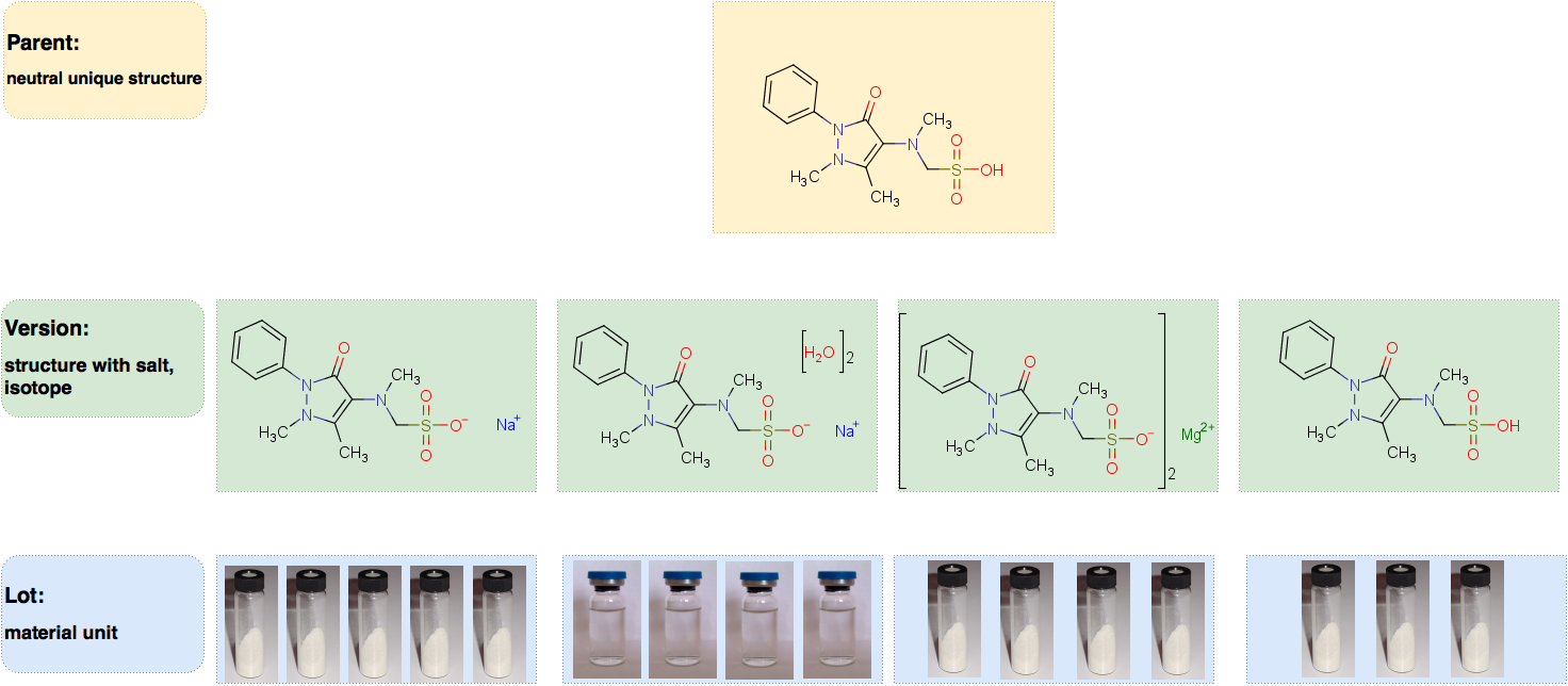 - Version : a molecule (neutral or charged) with its isotope, counter-ion or salt/solvate.