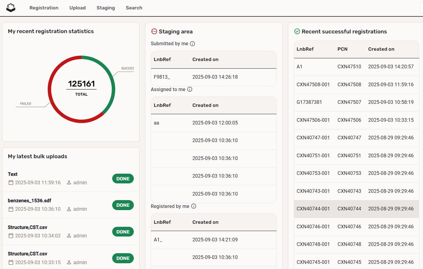 In order to register a compound, the user must click on the Registration navigation bar located on the top left side. The registrations can be initiated from the Registration page.