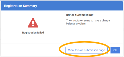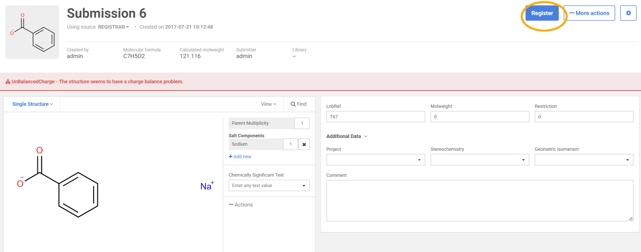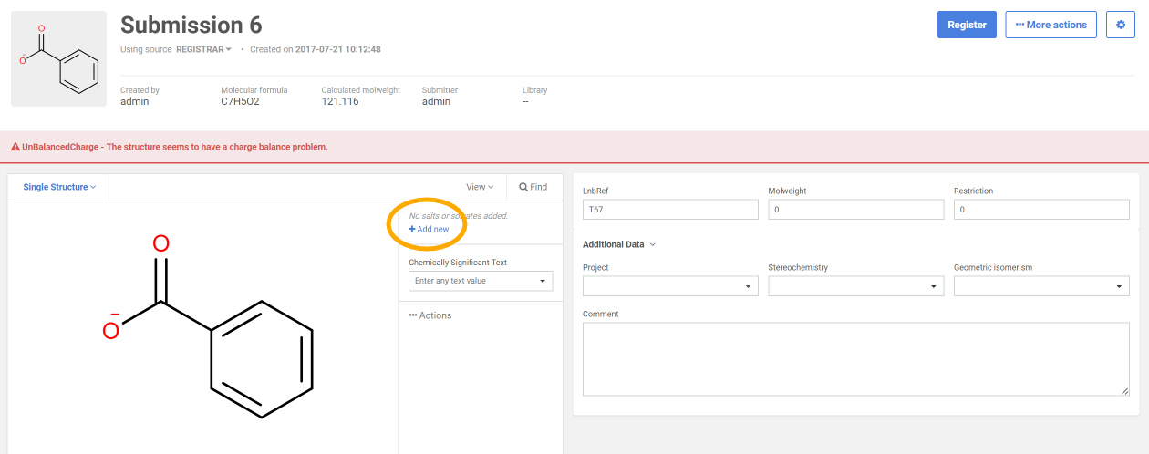 On the Submission page add a salt component from the Salt Dictionary in order to balance the charge of the compound.