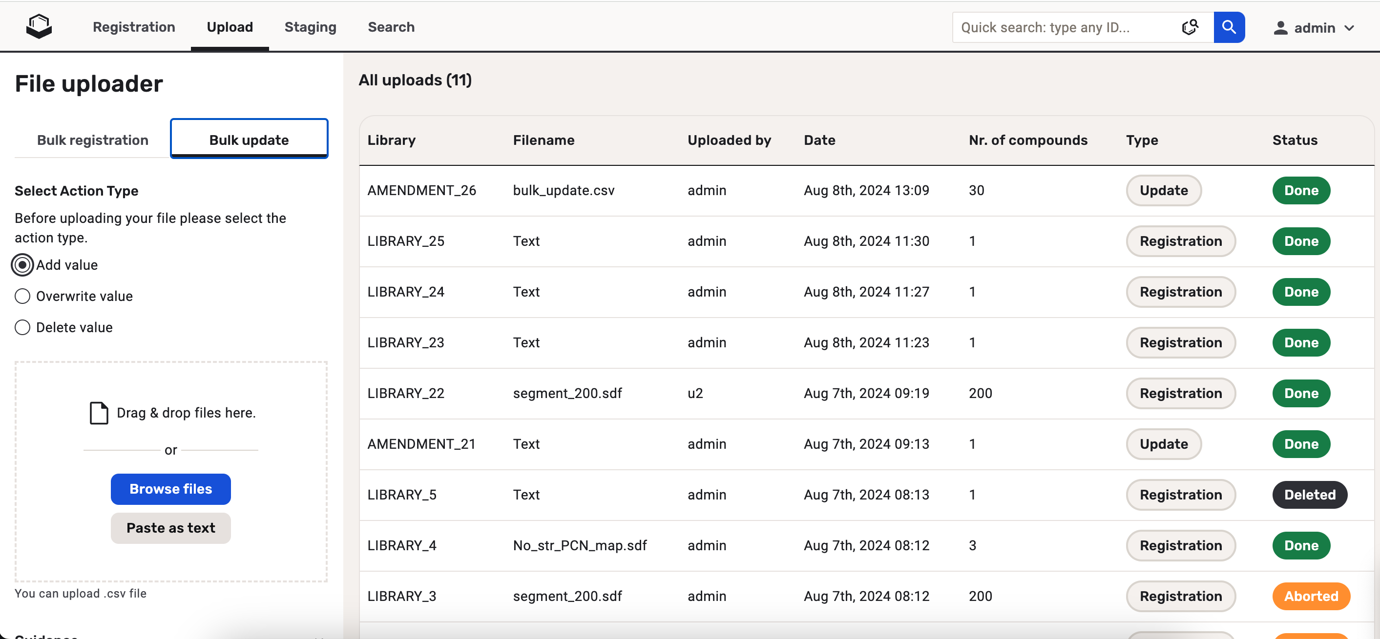 Since version 24.3.0 it is possible to bulk update (add, overwrite, delete) additional data of registered compounds by uploading a CSV file or you can paste as text. You can define the CSV delimiter in the Upload options. The value set there is valid for the bulk update file.