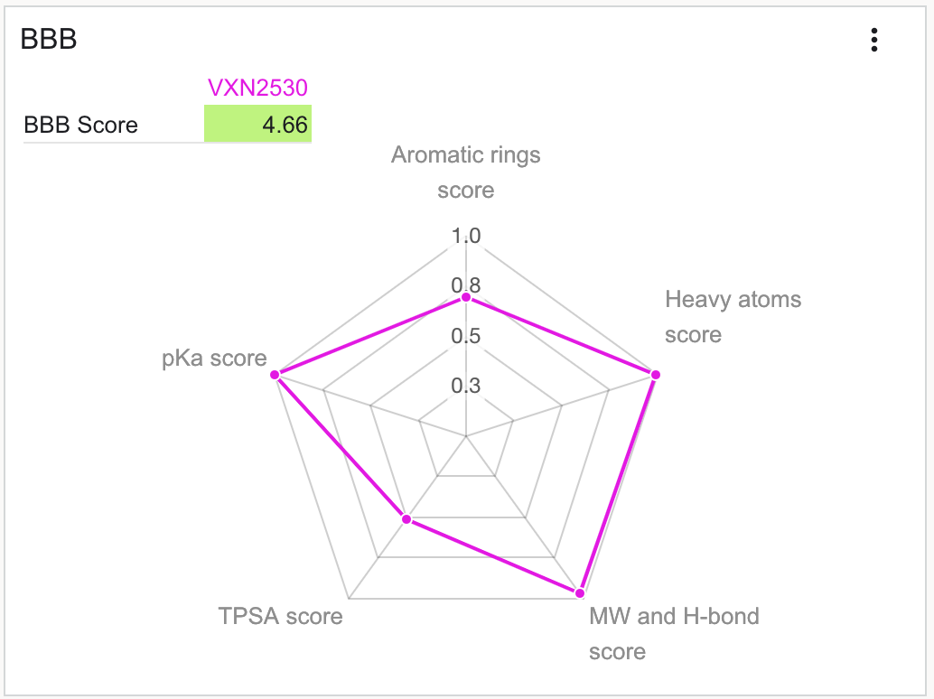 | BBB | Calculates and displays a radar plot of Gupta, Mayuri et al's BBB score. Calculations are performed using BBB Score tool Citation: J. Med. Chem. 2019, 62(21), 9824–9836. |