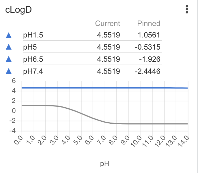 | cLogD | Calculates and displays a pH-logD chart. Calculations are performed using Chemaxon calculators Lipophilicity is usually measured by the octanol/water partitioning coefficient. Highly lipophilic compounds have an increased risk of being poorly soluble, quickly metabolized and promiscuous binders, whereas more polar compounds often are less permeable. Thus, lipophilicity is an important parameter for all ADMET properties of a drug, and a rule of thumb for an orally available drug is to keep it between 1-3, however the optimal interval can be different for different chemical series. |