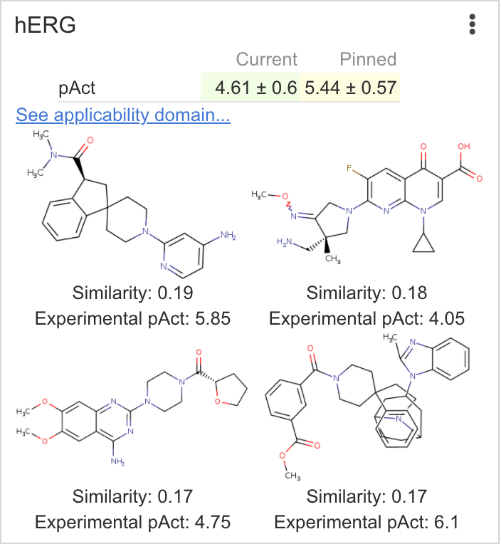 | hERG | Returns the predicted pIC50 value of a compound using a machine learning model trained on electrophysiological assays for hERG inhibition Calculations are performed using Chemaxon calculators To avoid side-effects from hitting the hERG channel, the predicted pAct value should be as low as possible. |
