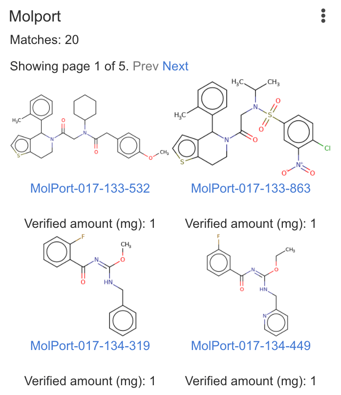 | Molport | Runs screening compound and starting material search in Molport. Requires online access to Molport involving your query structure. |