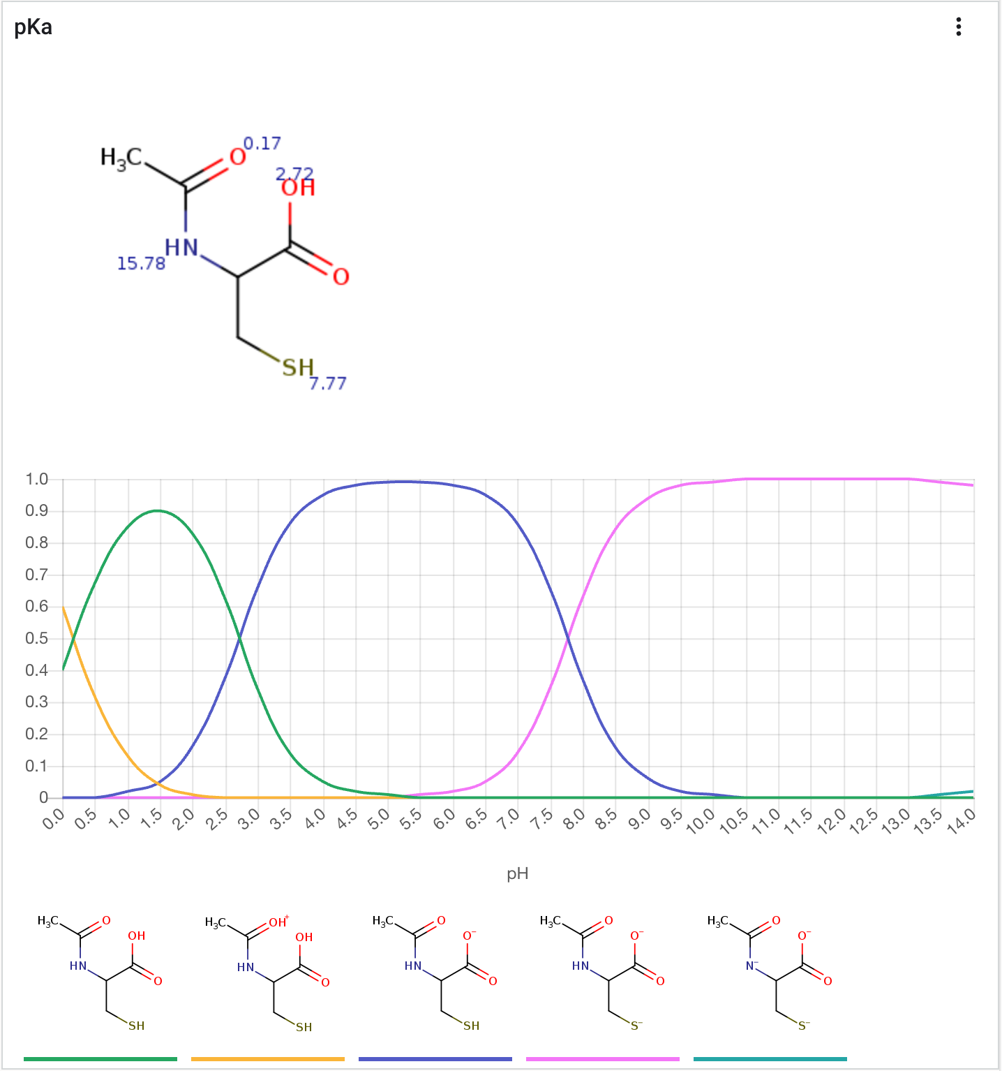 | pKa | Calculates and displays microspecies distribution chart. Calculations are performed using Chemaxon calculators pKa is a crucial descriptor in drug design, governing a compound's ionization state and significantly influencing its solubility, permeability, protein binding, and metabolic stability. Understanding pKa helps predict how a drug will behave in different biological environments and guides lead optimization to improve pharmacokinetic and pharmacodynamic profiles. Use this calculation to predict the ionization profile of your compounds, identify potential issues with charge at physiological pH, and design molecules with optimal pKa values for absorption and target interaction. |