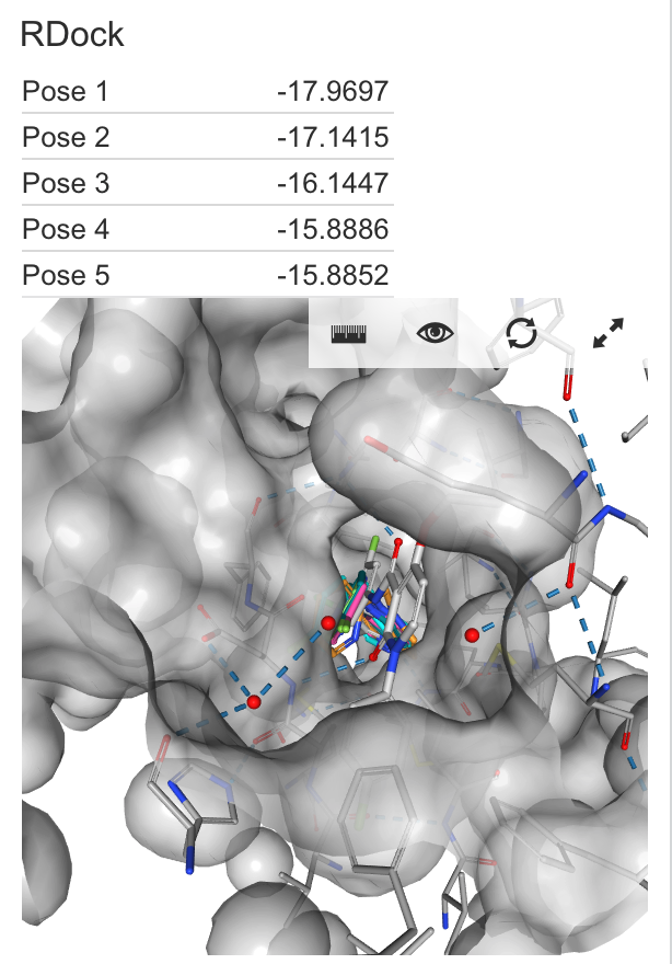 | RDock | This demonstration tool submits the compound to an external RDock docking service with ligand preparation and docking protocols. Requires per-project configuration and desktop applications. Ligand preparation performed using Chemaxon calculators Unlike other plugins, this takes a long time (usually on the order of minutes) to complete its calculations. Docking scores are reported as negative values, mimicking the free energy of binding. |