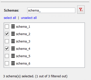 Here the schemas can be selected. In case of having multiple schemas in the connection, it is possible to apply a search filter as seen in the following example. Schemas can be selected by clicking the check box. The information about selected schemas and selected filtered schemas is show at the bottom.