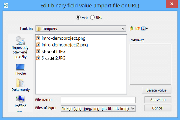 When the Browser Widget is being used to view data from a binary field (stored within the database) the value can be edited by selecting a file or URL content for uploading into the database for that record. This allows you to load images (or similar content) into the database on a record-by-record basis.