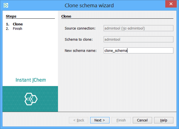 This operation can be performed with exactly one schema selected. When one schema from the schema list is selected and clone operations is clicked, the clone wizard is started and source connection with source schema are prefilled and are not editable any more. Only thing that is editable in this wizard is new schema name. It depends on user how he wants new cloned schema to be called.