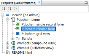 In order to interact with the data we must be able to access one of the form views and so far all of the form views are owned by admin. In order for other users to see them we must make them shared or visible. Expand the "PubChem Demo" data tree and open the "PubChem tabular form". Right click on the form and select the Share... option. Change the privilege for the ROLE_USER to Read and Copy from the dropdown menu and press OK. You can see the form icon has become "unlocked".