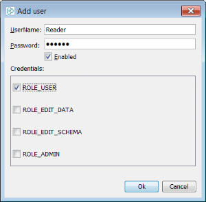 In the case of "Writer" we have assigned the roles "ROLE_EDIT_DATA" and "ROLE_USER". This user can read and write data but cannot make changes to the schema in any way.