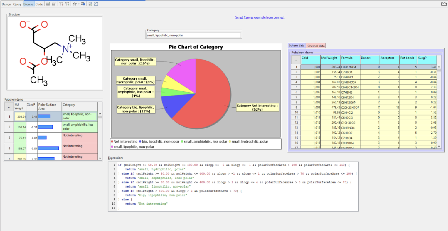 In this example, pie chart was created from a calculated field called Category, which distributes molecules in data set according to their on hydrophobicity, molar weight and polarity.