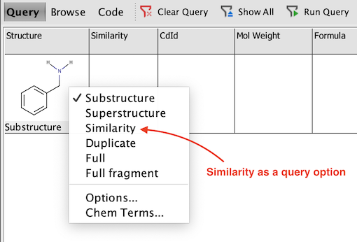 In order to use Similarity search, switch to the Query mode and draw the molecule which you want to use as a standard for your query.