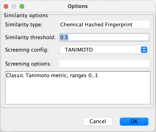 You will notice that default similarity is set to 0.5. In order to change the setting, right click the structure in Query mode and choose Options... Here you can modify Similarity threshold or change the method used to calculate Similarity (Screening config).