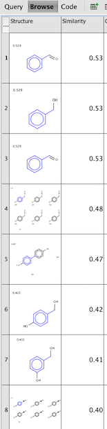 Once the query is run, compounds from your dataset with Similarity higher or equal to the threshold are shown. Screenshot below is an example of a query set in Pubchem demo on benzylamine with similarity threshold set to 0.4.