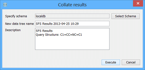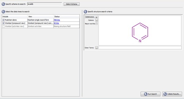With the searches complete you can optionally collate them into a single data set. Click on the 'Collate results...' button to start this process. This will result in the structures being loaded into a new database table and an IJC entity, data tree and grid view created for that tables so that you can view all the hits.