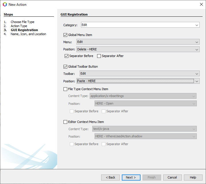 In the next panel, specify that the action will appear in the
