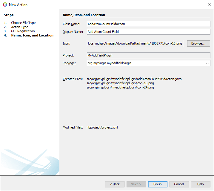 The wizard creates a new 'AddAtomCountFieldAction' class. In addition, the icons are copied into the module. You should see the action class in NetBeans 'Projects' explorer: