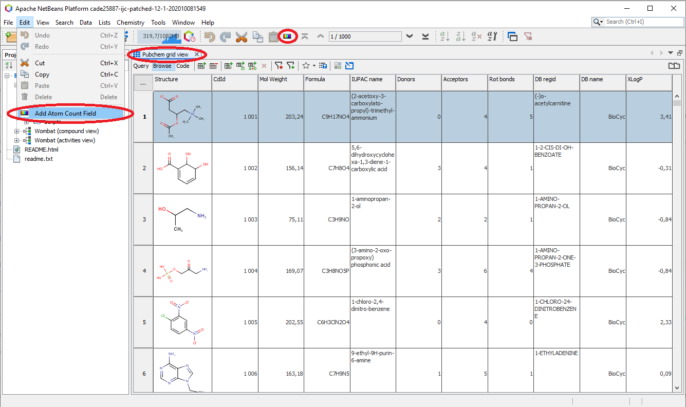 Edit -> Add Atom Count Fieldmenu item. It will add a new field called "Atom Count" to 'Pubchem demo' entity and will fill it with the actual atoms count for each structure.