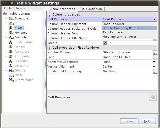 Instant JChem with the demo project - cell renderers available for 'LogP' columnThe list shows different renderers that are available for rendering 'LogP' column values. One of them is called'Simple Colouring Renderer'. This is the renderer that we will create in this tutorial. -