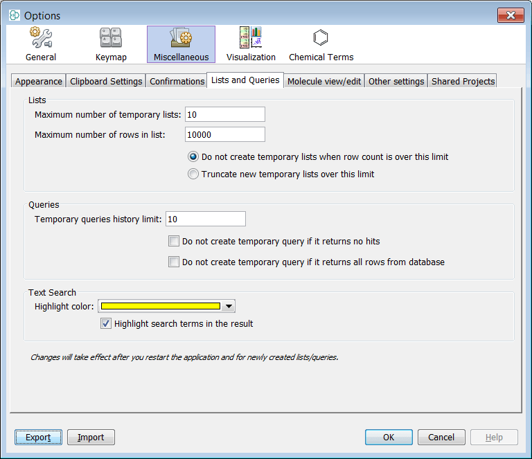By default, there are limitations on the number of rows in the list (10,000) and also the number of temporary lists (10). These values are selected to provide the optimal performance on most computers, but it may be of advantage or ever necessary for some use cases to change them. You can access these settings through the Tools > Options > Miscellaneous > Lists and Queries . Here you can also set how to proceed when the newly created list would contain more than 10,000 rows. By default, no new list is created but you can decide to truncate the list to the limit.
