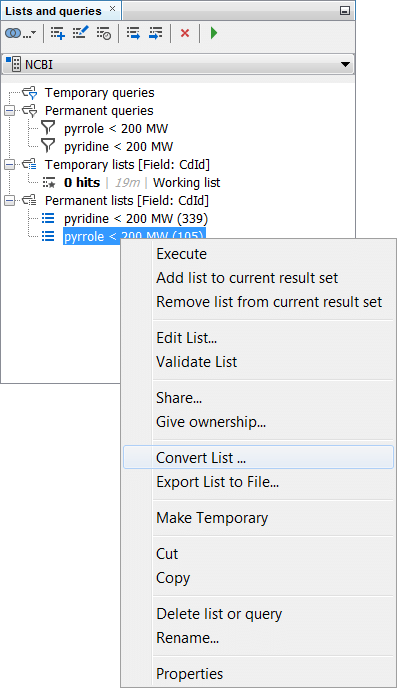 In the lists and queries window, you can notice the [Field: CdId] text in the list groups description. This means, that the list is saved as the CdId numbers of the respective rows. There is the possibility to change the field used to save the list. You can do so by by selecting the Convert List … option in the right-click menu. We will convert the “pyrrole < 200 MW” list based on the CdId field to one based on Formula. You can notice a new list is created in a new list group based on formula. You can notice that the converted list contains fewer records than the original one - 61 versus 105. This means that the original list contained duplicate structures or isomers (the value in formula field was not unique for each of the records).