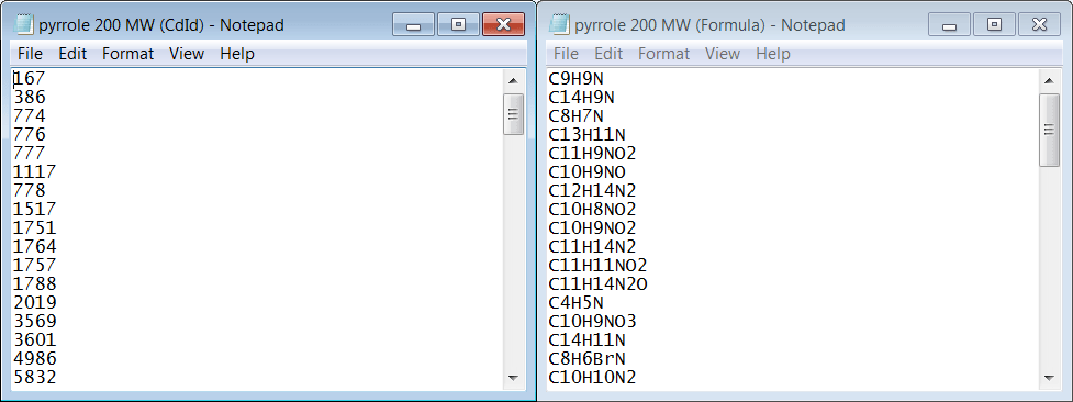 The lists can also be exported to a text file. You can do so by selecting Export List to File … option in the right-click menu. Keep in mind that only the list of values in the field of choice is saved in the list and not all the records in the database. We will save the lists “pyrrole < 200 MW” based on both CdId and Formula fields.