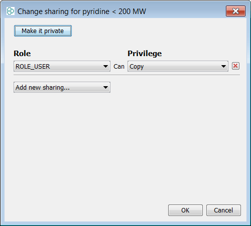 Now, we will reconnect to the schema under the editor username. You can notice the editor, unlike the user, can see the pyridine list and query directly, as the admin user set the sharing privilege to read. These readable items are marked with a red dot in the icon. We will need to create a new grid view for the editor. Now, we will run a new query, for chlorobenzene and molecular weight between 250 and 300. We will rename the new temporary list to “chlorobenzene 250-300 MW” and make it permanent. Now, we will give ownership of this list to the user by selecting the Give ownership… option in the right-click menu and choosing the user in the newly opened window. After confirmation, the new list disappears from the view, but it is available to copy from the new owner (as the default sharing option was not changed).