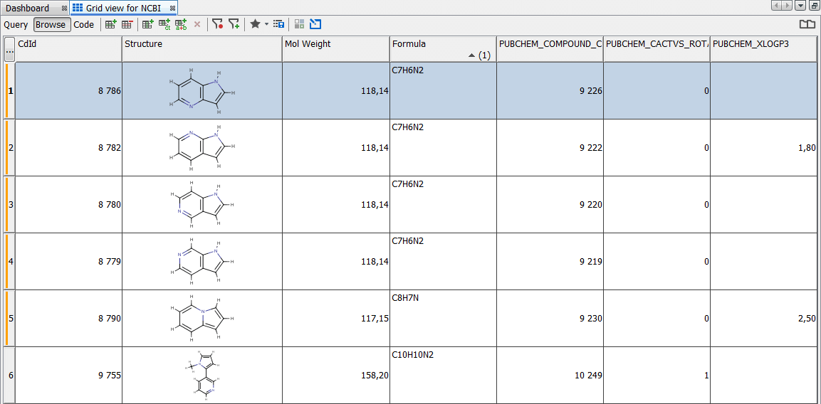 You can create other structure-based entities in this schema for the purposes of practice by right-clicking on the schema node and choosing " New Data Tree and structure entity (table)... " . We have used the first of the NCBI datasets, that can be found here. During the second import step, we have selected only three fields to import except for the structure - PUBCHEM_COMPOUND_ID, PUNCHEM_CACTVS_ROTATABLE_BONDS and PUBCHEM_XLOGP3. We will have a total of 23 408 entries in the NCBI entity.