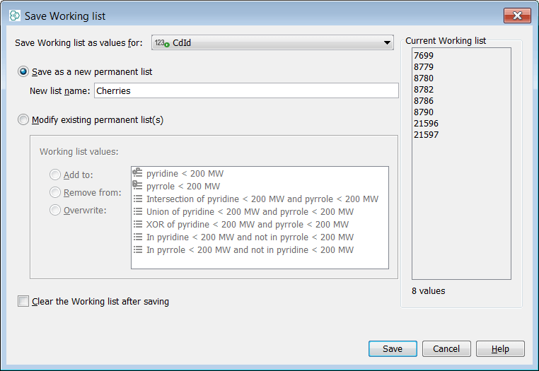 Now, we will add some more compounds to the working list. Let’s choose the XOR list and add first three hits to the working list. After doing so, you can notice that the working list contains now 8 hits. Using this approach, you can add to the working list any compound of interest from any of the lists, or directly from the gridview without using the lists to pre-select the hits. Then you can open the working list similarly to other lists, save it to a permanent list, or export similarly to other lists. When choosing the Save Working list… option, you can select how the working list will be saved. We will set the name to Cherries and other options will be left default. If you do not check the Clear the Working list after saving checkbox, you will keep the compounds in the temporary working list as well as in the newly created permanent list.
