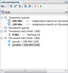 Let’s start with creating some temporary queries for the NCBI data tree. First, we can run a Substructure search for pyridine and add a condition of molecular weight below 200. A new temporary query and temporary list have been created for 339 hits.