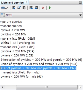 The two remaining operations are A and not B and B and not A. These operations shows only the results present in one of the lists and not in the other one. The A and B are selected based on order of selection of the list. In our case, these operations lead to 333 and 99 hits in the lists for “pyridine and not pyrrole < 200 MW” and “pyrrole and not pyridine < 200 MW” respectively.