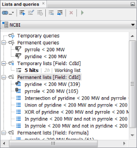 Let’s now close the Pubchem gridview and open the NCBI entity gridview. Now you can see there are neither temporary nor permanent lists or queries in the Lists and queries window, as this window shows only the lists and queries for the selected data tree.