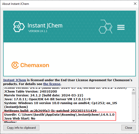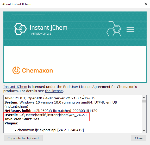 C:\Users\username\.instantjchem\ws_www.chemaxon.com_stable\var\log - for Java Web Start version.