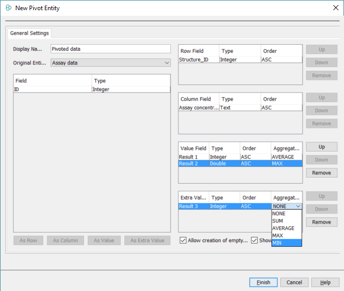 In both cases, a New Pivot Entity window opens (Fig. 5). In this dialog, please define the display name ( Pivoted data ), select the original entity (Assay data) and row (Structure_ID), column (Assay concentration), value (Result 1, Result 2) and extra value (Result 3) fields as displayed on Fig. 5. You can also set the aggregation for value and extra value fields, we have used average, min and max.