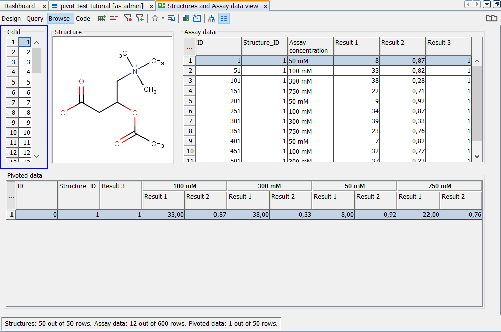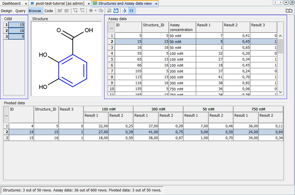 This will allow us to add widgets displaying data from Pivoted data entity together with other data in views related to Structures data tree. After clicking Finish button, you can go back to the project window and using right-click menu on the data tree node, create a new form view. In this tutorial, we will create a form Structures and Assay data view as in the screenshot below (Fig. 8). It contains one molecule pane (bound automatically to the Structure field, Structures entity) and three table widgets - one just for displaying CdId field from the Structures entity one bound to the original Assay data entity (all fields) and one to the Pivoted data entity (all fields).