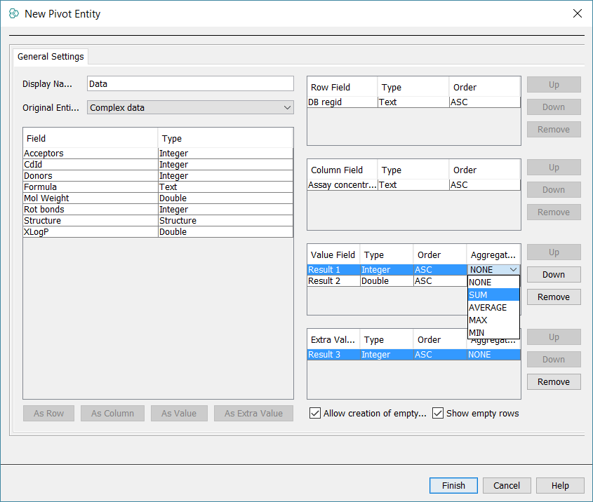 Similar to other entities, changes to the pivot entity can be done using Schema Editor (Fig. 5). Using the entities tab, it is possible to change the Display Name and aggregation of value and extra value fields. Also, the order of value and extra value fields can be changed.